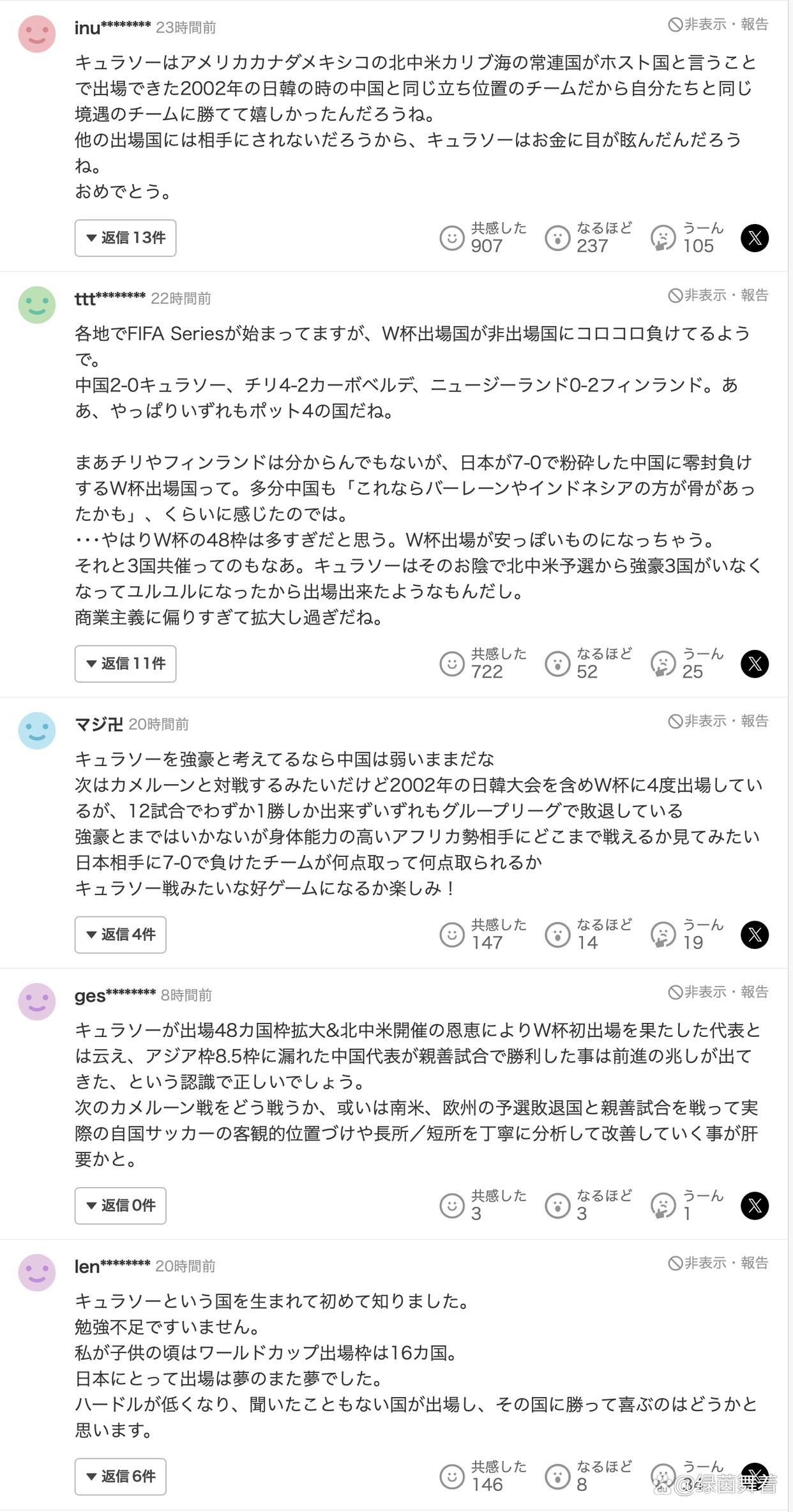 还有球迷留言道:“库拉索全国人口不足20万,可能有九成的日本人,都不知道这个国家在哪里。我特意去国际足联官网查了一下,库拉索队世界排名82,相比起排名第93的中国队来说,实力可能确实要更强一点。但我觉得他们之间应该不会有太大的差距,所以中国队赢球也没什么值得惊讶的,中国的媒体不至于如此大张旗鼓的欢庆吧。”